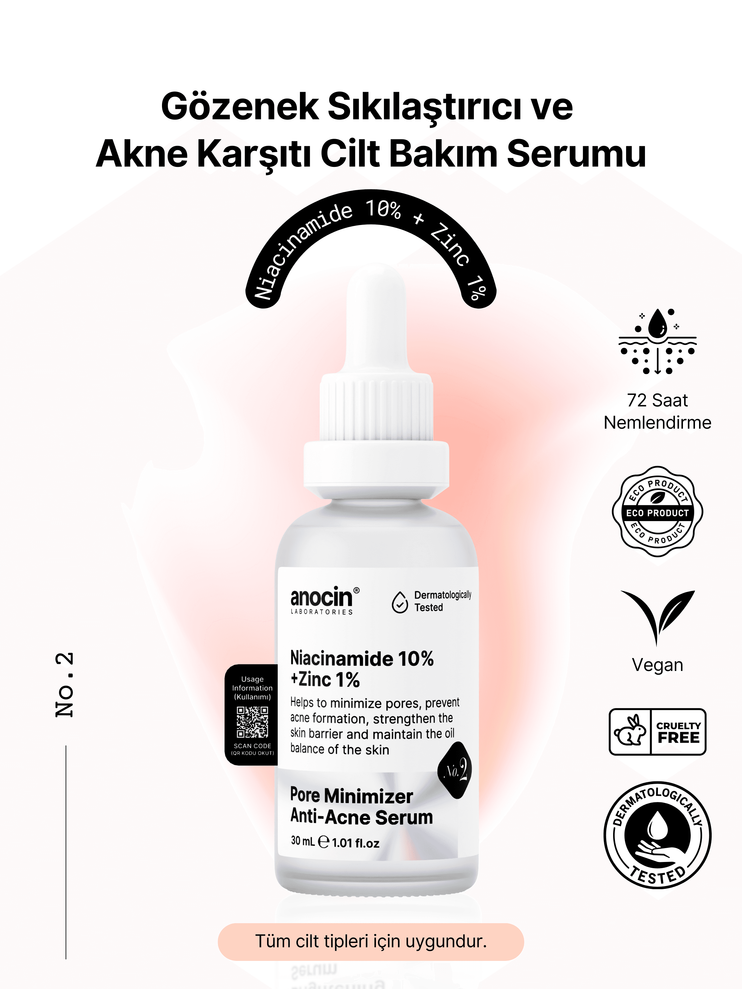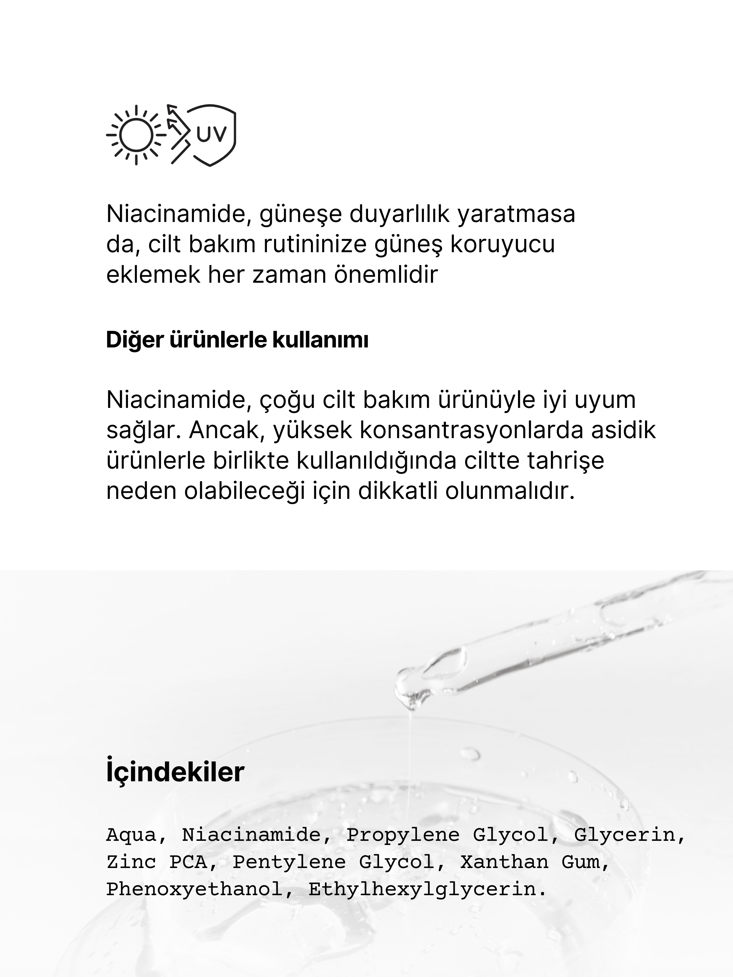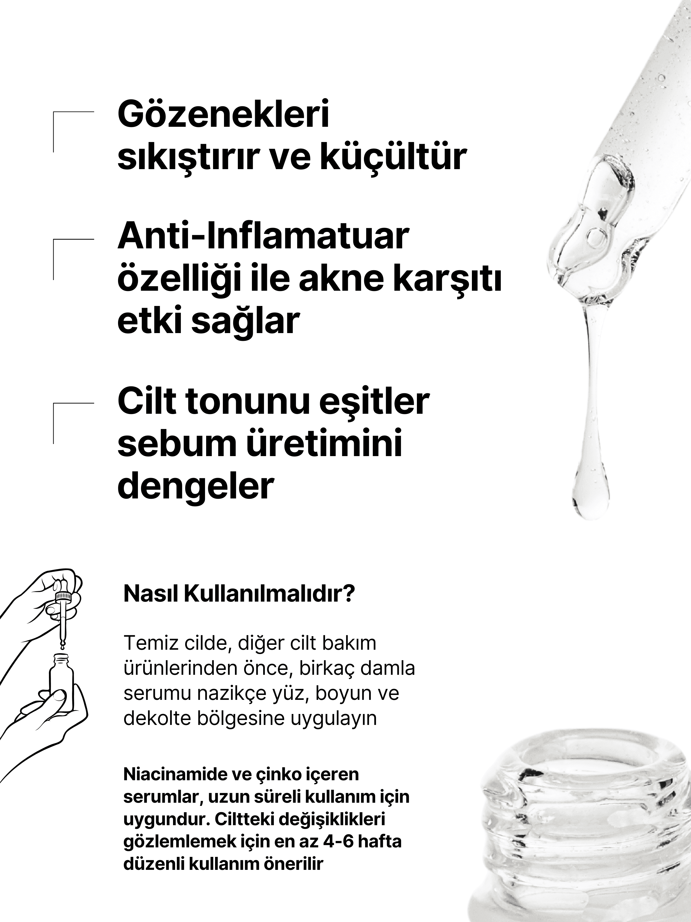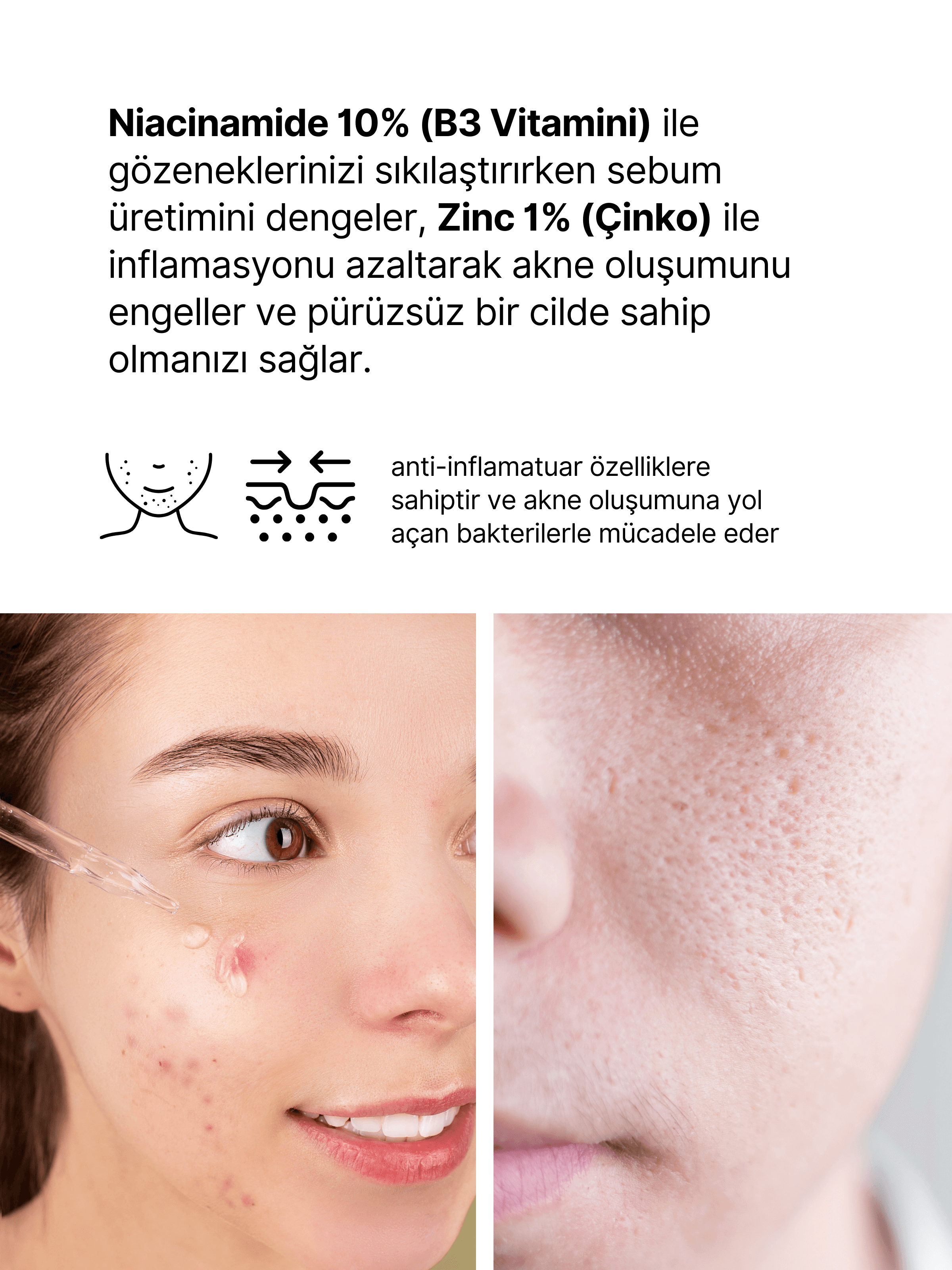 İçeriğindeki Niacinamid ile gözeneklerde gözle görülür sıkılaşma sağlarken akne oluşumunu da engelemeye yardımcı olur. Sebum üretimini kontrol etmek ve yağlı cildin parlak görünümünü azaltmak, cildin yağ dengesini sağlayarak cildinizi kurutmadan nemlendirir.